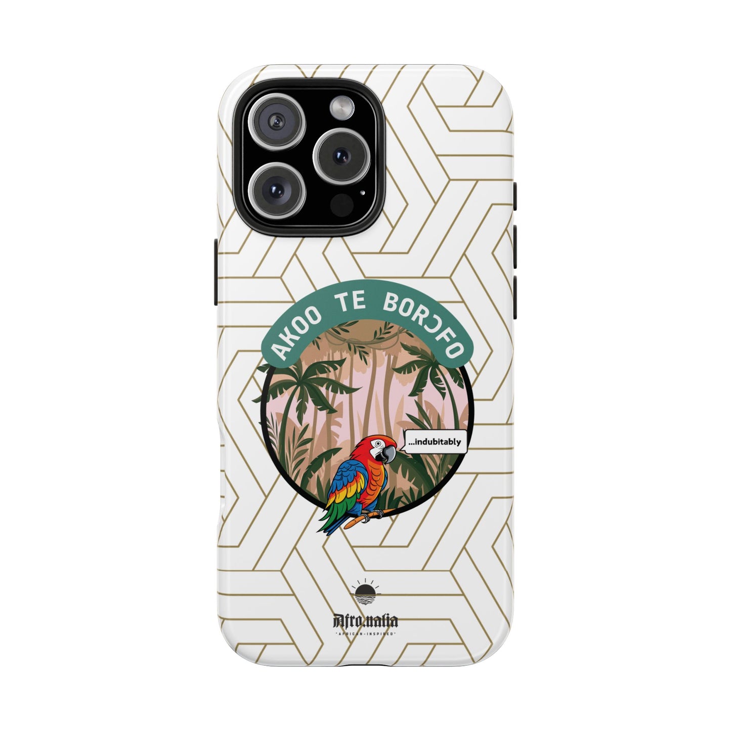 Akoo Te Borɔfo is a Twi/Fante saying that translates directly to "The Parrot understands English". The design is a humorous take on the late George Darko's song of the same name.